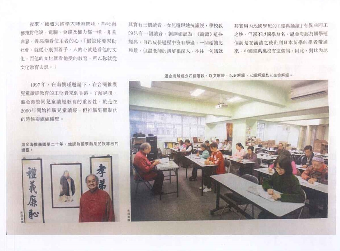 國際經典文化協會主席 溫金海先生接受報章訪問,細說推廣國學20年。當中更誠邀了多位文化界、教育界及家長分享他們的見解、體會及對未來的展望。