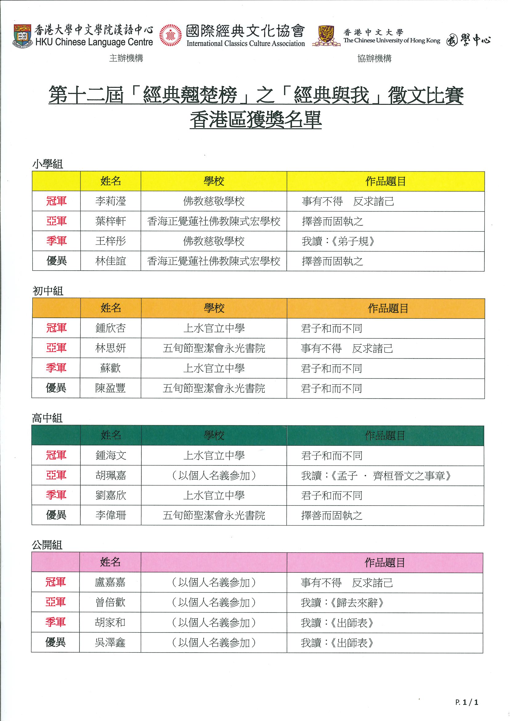 第十二屆「經典翹楚榜」之「經典與我」徵文比賽 - 香港區(獲獎名單)