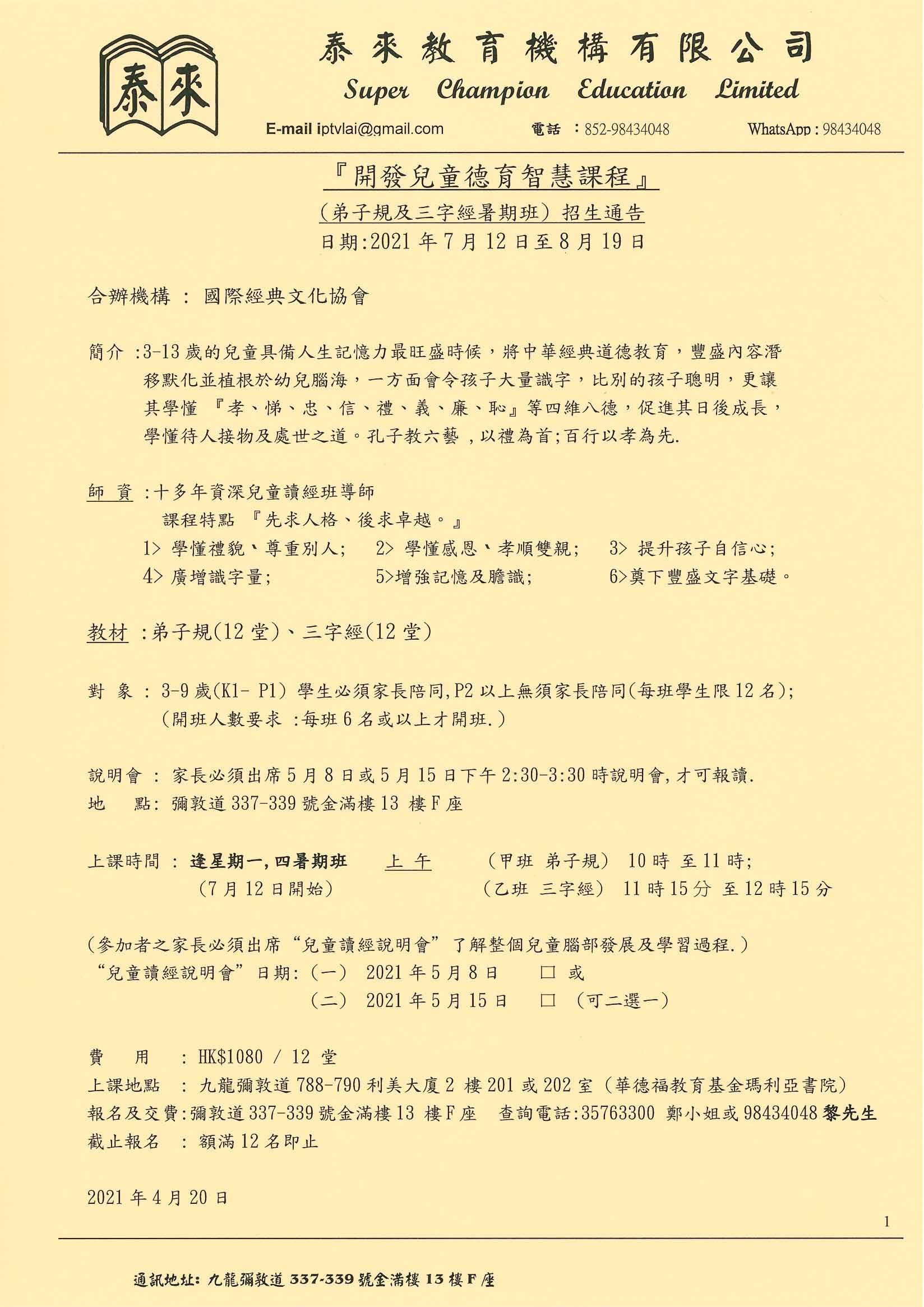 下一條 : 『開發兒童德育智慧課程』(親子班) : 2021年6月5日開始教授 “千字文”